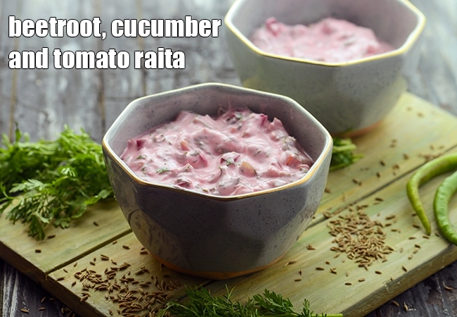 Explore many raitas you can make with curd. Beetroot, cucumber and tomato raita is a nourishing accompaniment to any main meal. Healthy cucumber tomato beetroot raita is sure to satisfy your taste buds and hunger both.