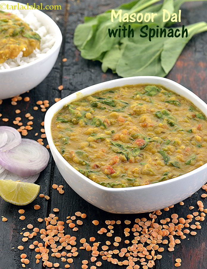 See Masoor Dal with Spinach recipe. Masoor dal with spinach, the unbeatable combination of masoor dal with spinach nourishes your body with proteins, iron and folic acid. Tomatoes and amchur powder lend a nice tangy flavour to the dal. Needless to add, this is a super-healthy recipe as protein-rich dals are an indispensable part of our daily diet! Serve it hot with rotis or rice to make a homely and satisfying meal. If you like masoor dal then do check out our recipes using masoor dal, it has recipes for snacks, soups, main course etc. Enjoy how to make Masoor Dal with Spinach recipe with detailed step by step photos and video below.