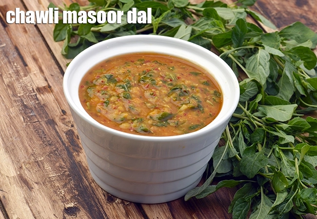 Chawli leaves added to masoor dal make a pregnancy friendly chawli masoor dal recipe. Chawli is one of the richest sources of iron and vitamin A and ideal for pregnant women.