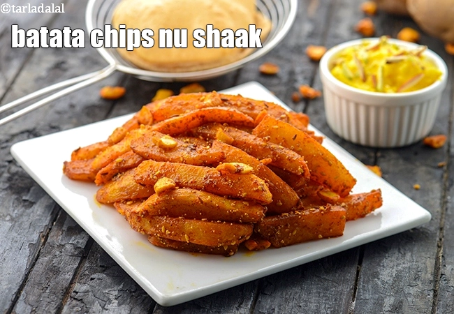 Potato strips deep-fried and tossed in an array of spices this Bateta Chips Nu Shaak is popular in wedding and festival menus. We generally call “Bateta Nu Shaak” an emergency subzi because it is quick to cook and also made with easily available ingredients when you forget to buy vegetables. If you don’t like the dry preparation, make this Rasawala Bateta Nu Shaak that complements roti/thepla as well as khichdi.