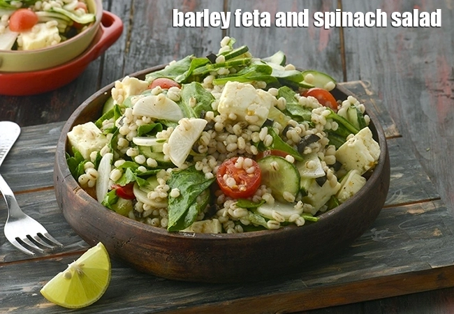barley feta and spinach salad recipe | Indian pearl barley with spinach and feta | healthy Mediterranean spinach and barley salad