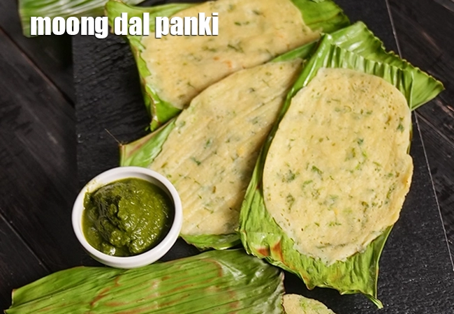 Panki, a popular Gujarati snack is a very thin pancake made out of any type of flour mixed with curds and lightly spiced with cumin seeds, green chillies and ginger. As you may have guessed, the name originates from the word paan or leaf, and this snack is actually cooked between two well-greased banana leaves. The leaves impart a special rustic flavour to the pankis. These delicate pancakes are light on the stomach and ideally eaten fresh with tongue-tickling chutneys. Make these delectable, steamed Moong Dal Panki, Green Peas Panki, Corn Panki.