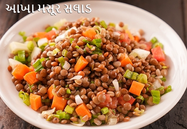 આખા મસૂર સલાડ રેસીપી | સ્વસ્થ આખા લાલ મસૂર ભારતીય સલાડ | પ્રોટીનથી ભરપૂર મસૂર સલાડ | See whole masoor salad recipe | આખા મસૂર સલાડના એક સર્વિંગથી તમારા ભલામણ કરેલ ડાયેટરી એલાઉન્સ (RDA) ના 16% ફોલિક એસિડ, 20% વિટામિન B1, 20% પ્રોટીન, 28% ફાઇબર, આયર્ન 19%, 50% ફોસ્ફરસ મળે છે.