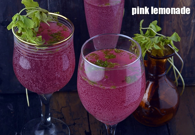Pink Lemonade a perfect blend of soothing rose syrup and peppy lemon juice, with mint leaves for added zing.