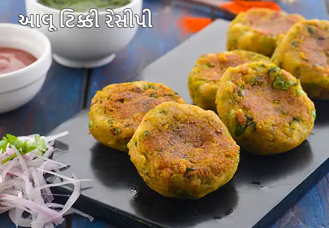 આલૂ ટિક્કી — મસાલેદાર બટાકાની પેટિસ, જે ચટણી સાથે ખૂબ જ સ્વાદિષ્ટ લાગે છે — બહારથી કરકરી, અંદરથી નરમ.