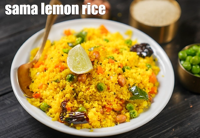 sama lemon rice recipe | little millet vegetable lemon rice | healthy barnyard millet lemon rice | sama lemon rice recipe, also known as barnyard millet lemon rice, is a delightful fusion of the nutty goodness of sama (little millet) and the zesty tang of lemon. It's inspired from a traditional South Indian lemon rice recipe.