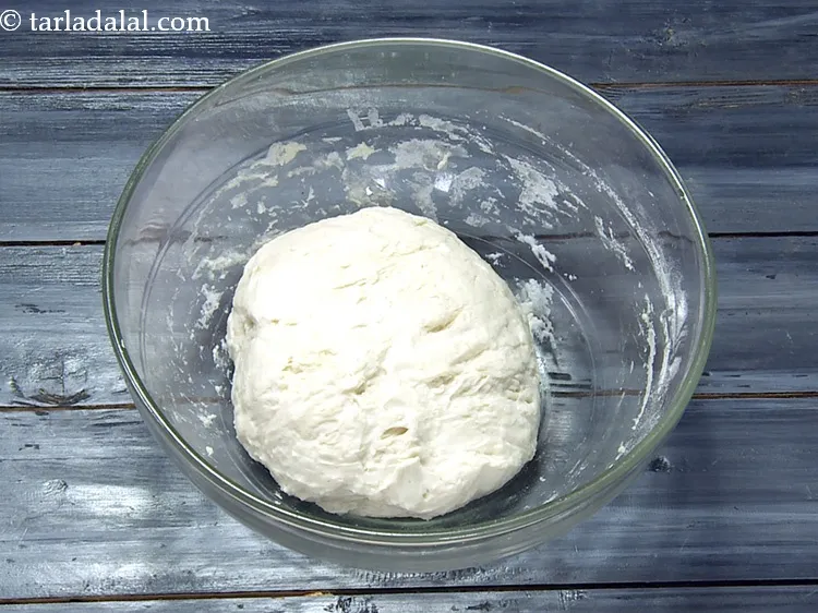- Combine the plain flour, yeast-sugar mixture, curds and salt and in a deep bowl and knead into a soft dough, using enough water.