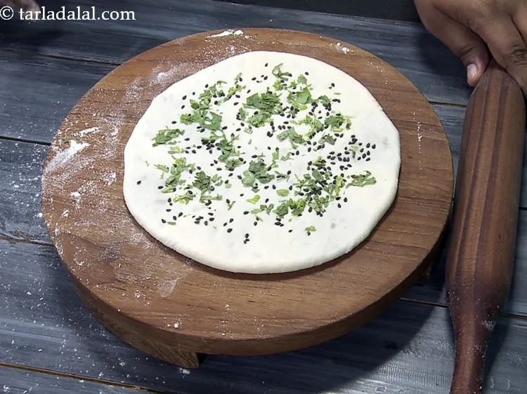 - Sprinkle ½ tsp of black sesame seeds and 1 tsp of coriander evenly over it and roll again into 200 mm. (8”) diameter circle using a little plain flour for rolling.