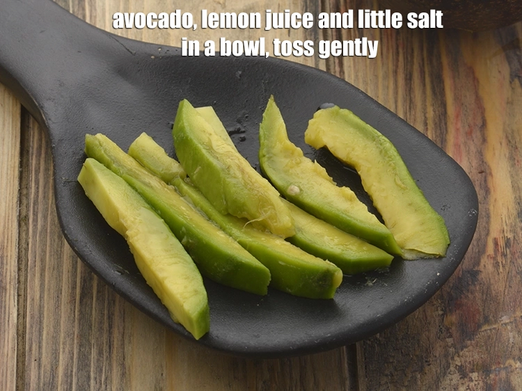 To make the stuffing, put 10 thin avocado strips, 1/4 tsp lemon juice and little salt to taste in a bowl, toss gently and keep aside.