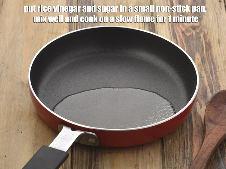 - Combine the rice vinegar and sugar in a small non-stick pan, mix well and cook on a slow flame for 1 minute, while stirring occasionally. Keep aside to cool completely.