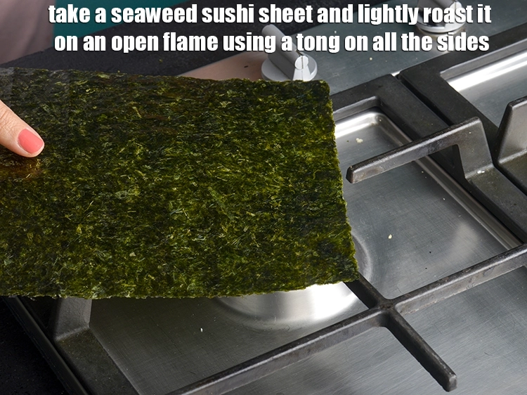 - Take a seaweed sushi sheet and lightly roast it on an open flame using a tong on all the sides.