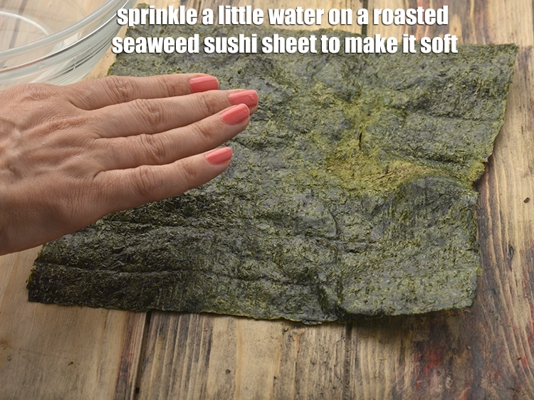 - Sprinkle a little water on a roasted seaweed sushi sheet to make it soft.