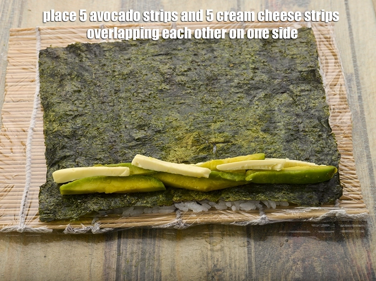 Place 5 avocado strips and 5 cream cheese cube strips overlapping each other on one side of the bamboo mat.