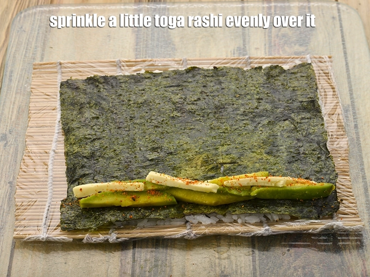 - Place 5 avocado strips and 5 cream cheese strips overlapping each other on one side of the bamboo mat and sprinkle a little toga rashi evenly over it.