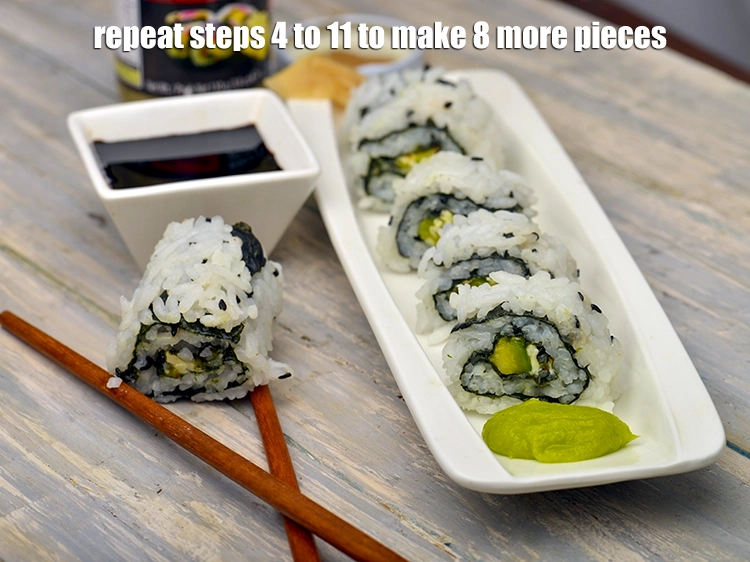 Serve Avocado and Cream Cheese Sushi, Veg Avocado and Cream Cheese Sushi immediately withwasabi sauce, soy sauce and pickled sushi ginger.