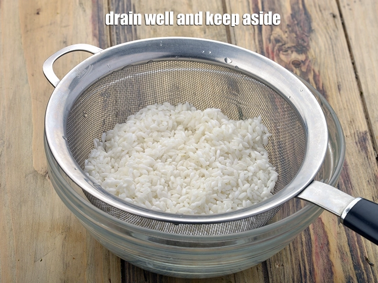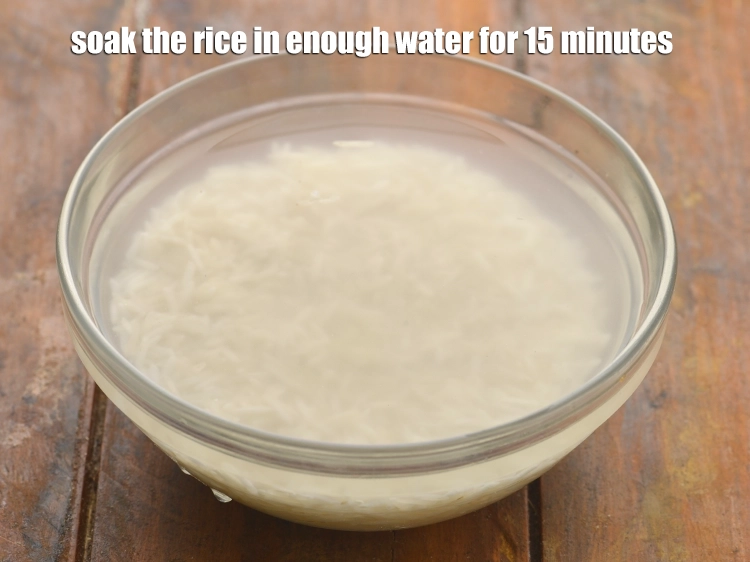 - Soak the rice in enough water for 15 minutes,. Drain well and keep aside.