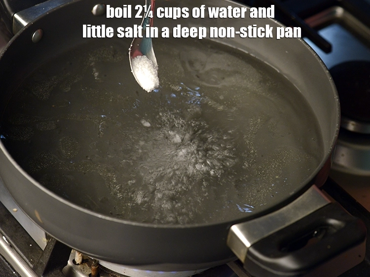 Boil 2¼ cups of water and little salt to taste in a deep non-stick pan.