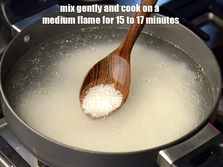 - Boil 2¼ cups of water and little salt in a deep non-stick pan, add the rice, mix gently and cook on a medium flame for 15 to 17 minutes or till the rice is cooked and the water is evaporated completely, while stirring occasionally.