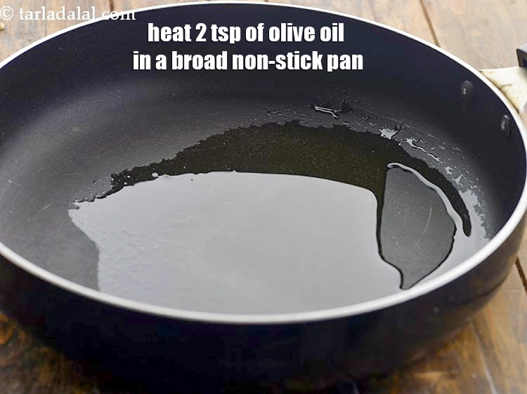 - Heat 2 tsp of olive oil in a broad non-stick pan, add the potato halves and sauté on a medium flame for 5 minutes. Transfer it into a bowl and keep aside.