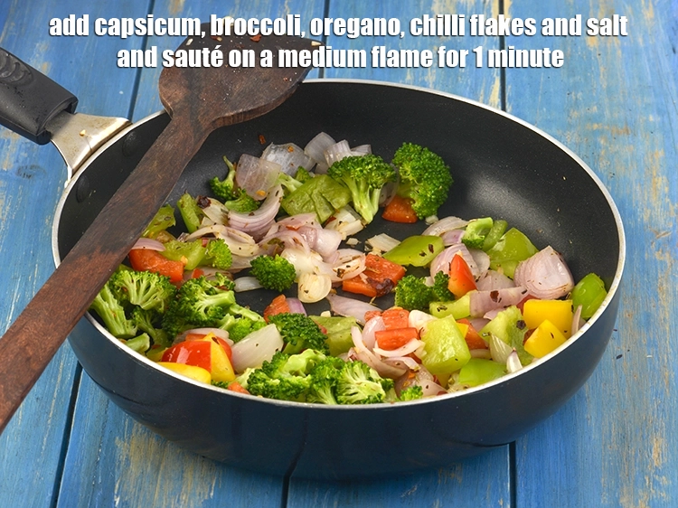 - Add the capsicum, broccoli, oregano, chilli flakes and salt and sauté on a medium flame for 1 minute.