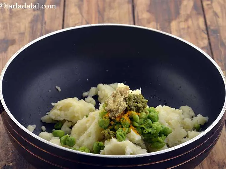 - Add the potatoes, green peas, turmeric powder, ginger-green chilli paste, coriander and salt, mix well and cook on a medium flame for 2 minutes.