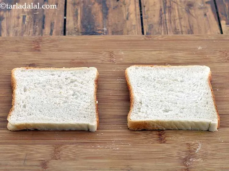 To make bread pakora recipe | Mumbai style bread pakora | Punjabi bread pakora with aloo stuffing | stuffed bread pakora | keep 2 slices of bread on a clean, moiture-free and flat surface. You can use either small or big bread slices as per your liking.