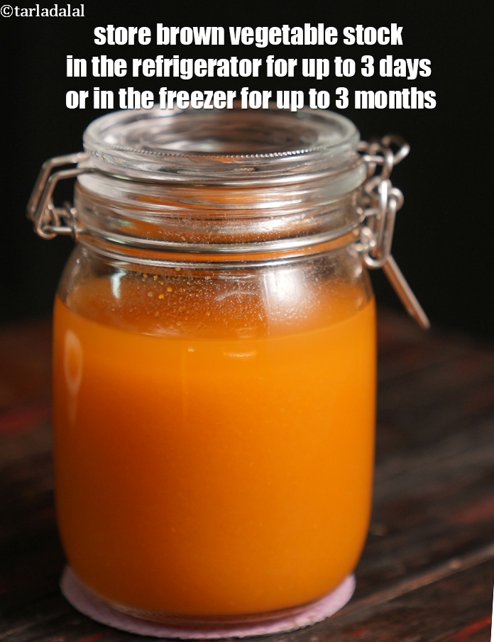 ब्राउन वेजिटेबल स्टॉक को रेफ्रिजरेटर में 3 दिनों तक या फ्रीजर में 3 महीने तक स्टोर करें।