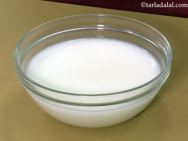 - पानी निकाल कर अलग रख दें। एक गहरे बाउल में १ १/२ कप पानी और दही मिलाएँ और अच्छी तरह फेंट लें। एक तरफ रख दें।