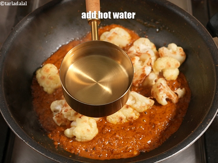 - भूनी हुई फूलगोभी, 1/2 कप गरम पानी और स्वादानुसार नमक डालें। अच्छी तरह मिलाएँ।