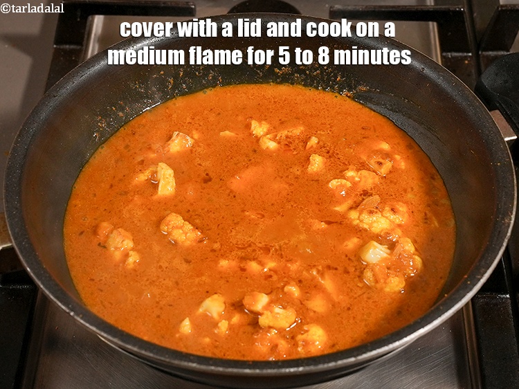 - ढक्कन से ढँक दें और मध्यम आँच पर 5 से 8 मिनट तक पकाएँ।