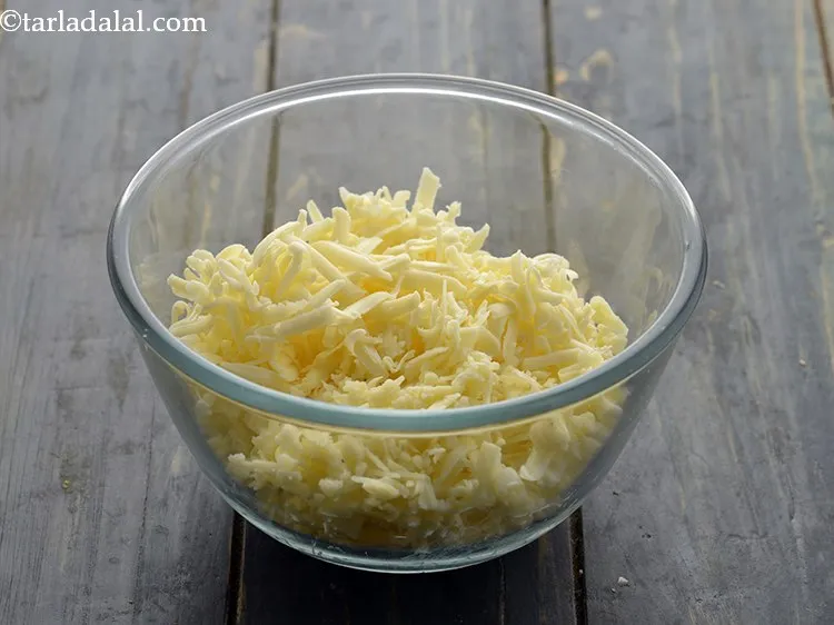 Notes on cheese paratha recipe. 1. Gradually add water to form a dough. The quantity of water will depend upon the quality of flour. Knead into a soft dough using enough water. We have used approx. 5 tbsp of water. While making stuffed paratha always knead the dough little soft so it is easy to stuff and roll the parathas. 2. For making the cheese stuffing of cheese paratha, take a block of cheese and grate it. Measure 1 1/2 cups and transfer into a deep bowl. You can even take part mozzarella, cheddar cheese to make the cheese paratha. Note that taking cheese from cheese blocks is far healthy cheese with good fats and makes this then a healthy cheese paratha. I always use cheese blocks to make cheese paratha so that I can have it.