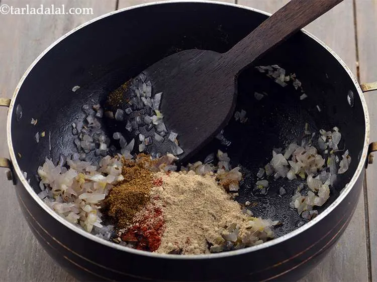 - When the seeds crackle, add the onions, ginger and garlic and sauté on a medium flame for 1 to 2 minute or till the onions turn translucent.