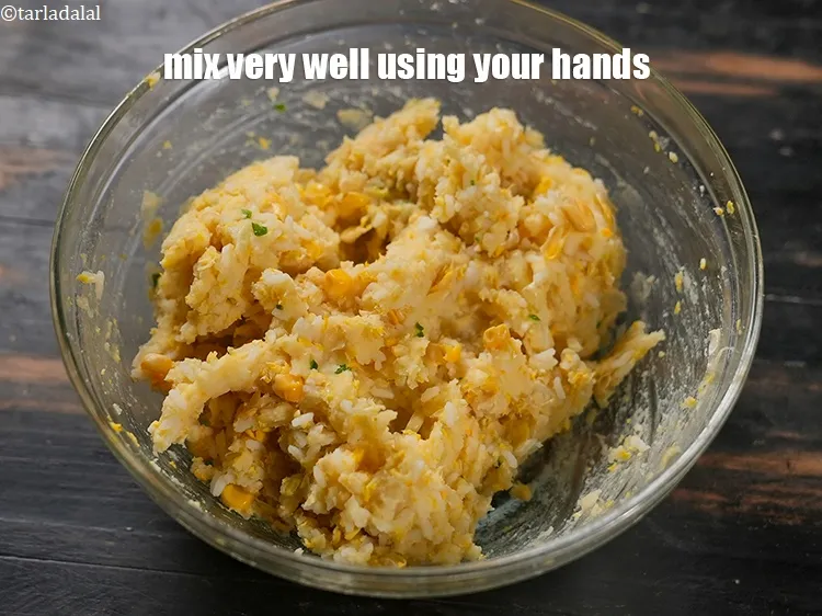 - Once cooled, add the corn, rice, green chillies and salt and mix very well using your hands.