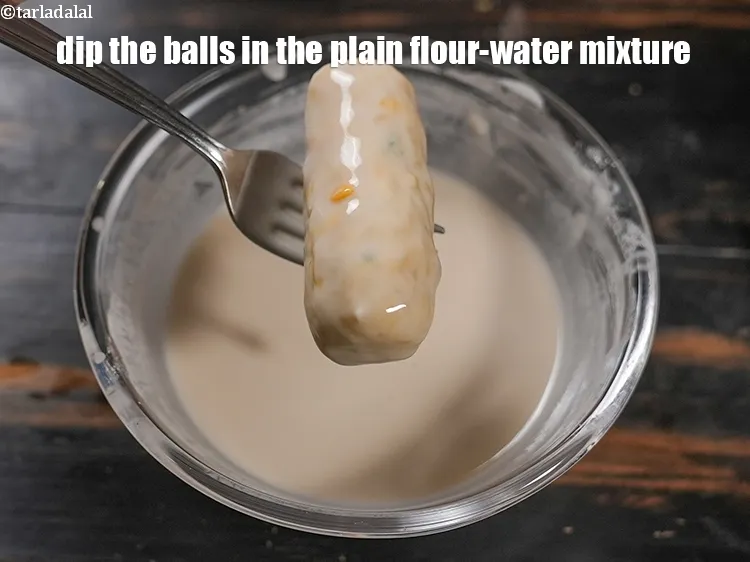 - Dip the balls in the plain flour-water mixture and roll it in bread crumbs till they are evenly coated from all the sides.