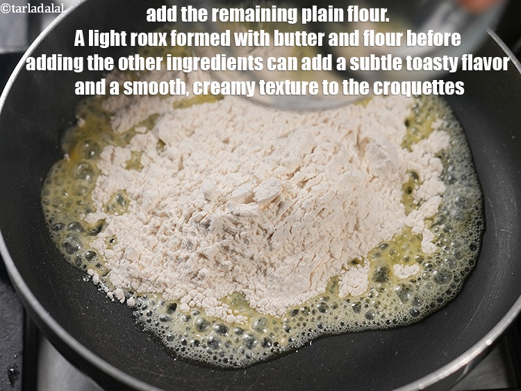 Add the remaining ¾ cup of plain flour (maida). A light roux formed with butter and flour before adding the other ingredients can add a subtle toasty flavor and a smooth, creamy texture to the croquettes.