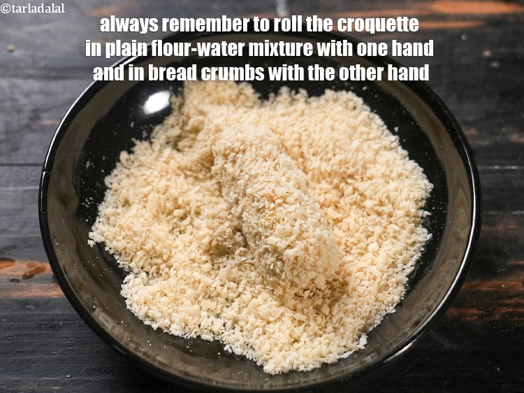 Always remember to roll the croquette in plain flour-water mixture with one hand and in bread crumbs with the other hand. This will help to prevent the hands from turning out to be messy and also get croquettes with shape perfect.
