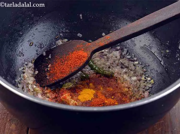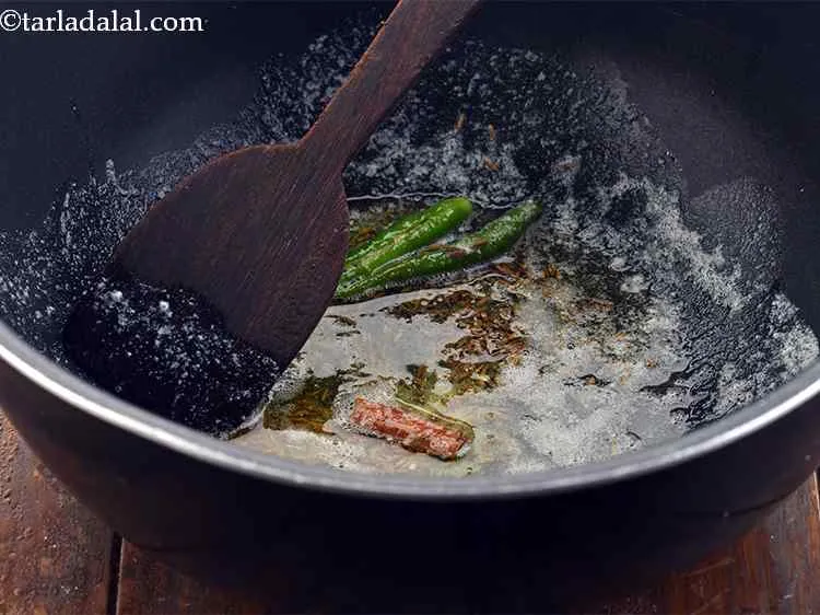 - जब जीरा चटकने लगे तब उसमें हरी मिर्च, दालचीनी, लौंग, ईलायची और प्याज़ डालिए और प्याज़ सुनहरे रंग के होने तक भूनिए।