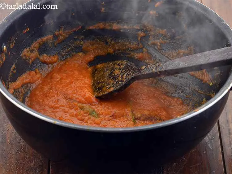 टमाटर के मिश्रणको तेल छुटने तक भूनें और मसाले अच्छी तरह से मिश्रित हो जाए। इसे मध्यम आंच पर लगभग ८-१० मिनट का समय लगेगा।