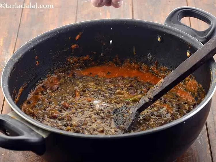 अगर दाल मखनी गाढ़ी है, तो थोड़ा पानी (लगभग २-३ टेबल-स्पून) डालें और अच्छी तरह मिलाएँ।