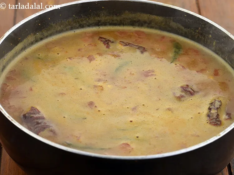 Mix well and cook on a medium flame for 6 minutes, while stirring occasionally. Stirring is necessary to avoid the dal rasam from sticking to the pan.