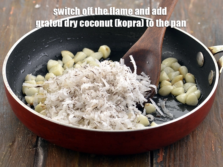Switch off the flame and add the 1/4 cup grated dry coconut (kopra) to the pan
