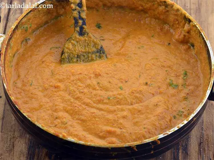 The dum aloo gravy gets its deep flavour and luscious texture from a paste of onions and spices, cooked along with tomato pulp and fresh cream.