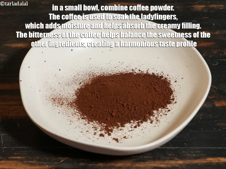 अंडे रहित तिरामिसू केक रेसिपी | भारतीय स्टाइल तिरामिसू केक | बिना बेक किए क्लासिक तिरामिसू | अंडे रहित तिरामिसू केक रेसिपी हिंदी में | बनाने के लिए एक छोटे कटोरे में, २ टी-स्पून कॉफी पाउडर मिलाएं। कॉफी का उपयोग भिंडी को भिगोने के लिए किया जाता है, जो नमी प्रदान करता है और मलाईदार भरावन को अवशोषित करने में मदद करता है। कॉफी की कड़वाहट अन्य सामग्री की मिठास को संतुलित करने में मदद करती है, जिससे एक सामंजस्यपूर्ण स्वाद प्रोफ़ाइल बनती है।