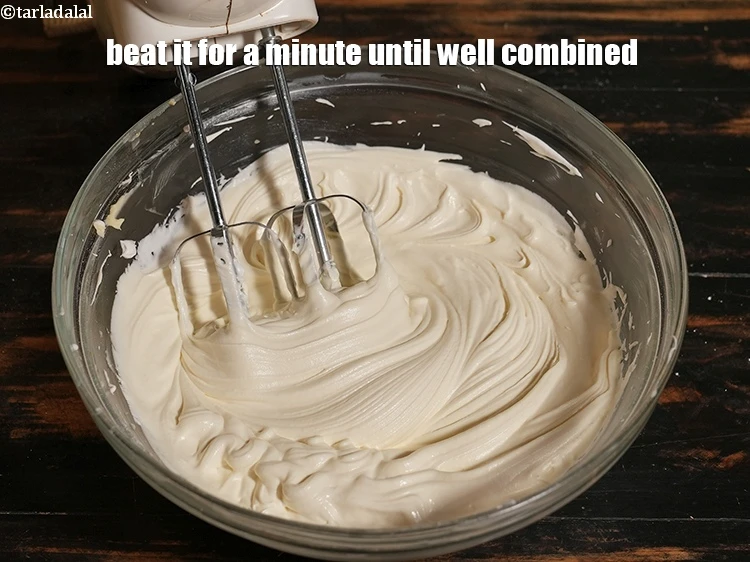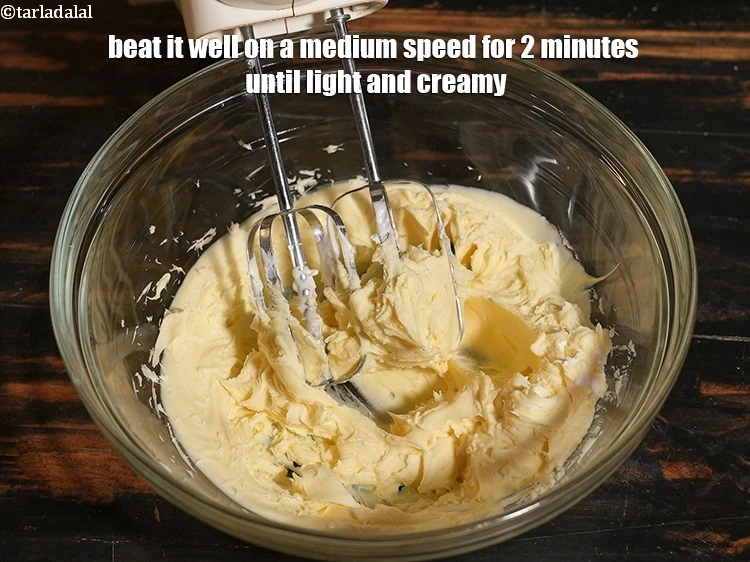 इसे मध्यम गति पर 2 मिनट तक अच्छी तरह से फेंटें जब तक मिश्रण हल्का और मलाईदार न हो जाए।