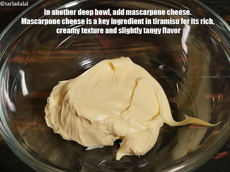 एक दूसरे गहरे कटोरे में, १/२ कप मस्करपोन चीज़ डालें। मस्करपोन चीज़ तिरामिसू में अपनी समृद्ध, मलाईदार बनावट और थोड़े तीखे स्वाद के लिए एक प्रमुख घटक है। यह एक स्वादिष्ट भराई प्रदान करता है जो कॉफी में भिगोए गए भिंडी के साथ खूबसूरती से विपरीत होता है।