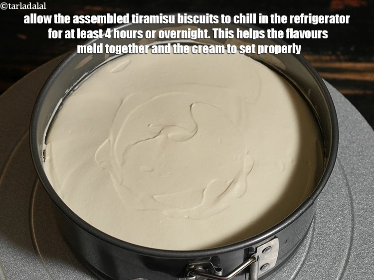 इकट्ठे किए गए तिरामिसू बिस्किट को कम से कम 4 घंटे या रात भर के लिए रेफ्रिजरेटर में ठंडा होने दें। इससे फ्लेवर आपस में मिल जाते हैं और क्रीम ठीक से जम जाती है।