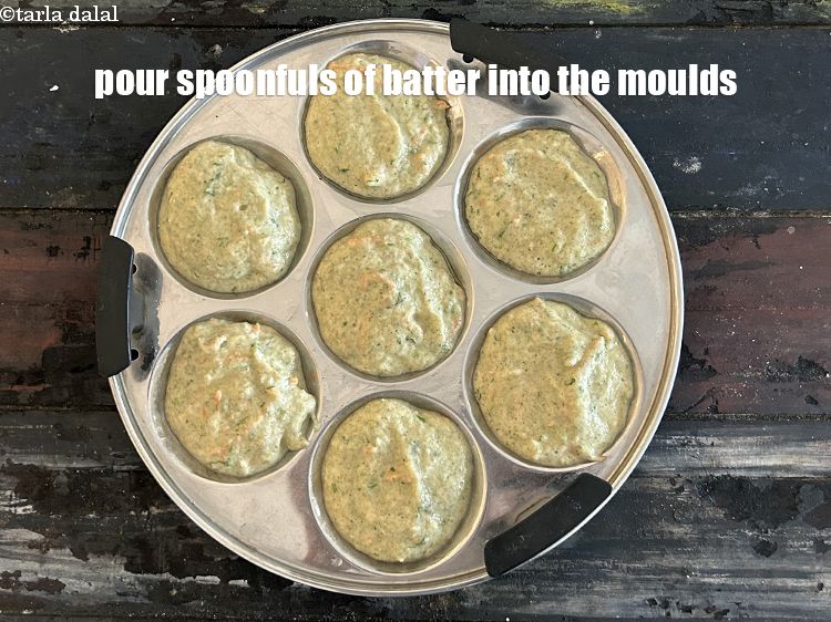चिकना किए हुए इडली के सांचों में चम्मच भर बैटर डालें।