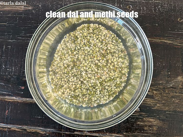 पर्याप्त पानी डालें और दाल और मेथी के दानों को धो लें। गंदगी देखें। आपको पानी को 3 से 4 बार पानी बदलना होगा।