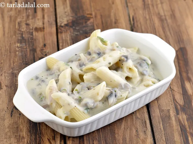 Very tasty; good change from useful tomato-based pastas. I made some changes because I am vegan (don't eat dairy). As substitute for butter I used olive oil and a little coconut oil for richness. Instead of dairy cheese I used a homemade 'cheese' made from cashews. I didn't have time to make white sauce (I would have used non-dairy milk if I had made it) but I had some leftover celery soup I had made earlier so I used this instead and it worked well. (Similar to this soup http://tarladalal.com/Cream-Of-Celery-Soup-%28-Protein-Rich-Recipes-%29-33254r). Also I included some garlic, cooked some fresh green peas with the mushrooms for a bright colour and added a splash of non-alcoholic white wine while cooking the vegetables.