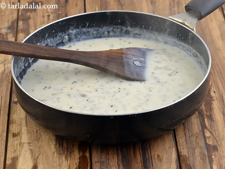 - Add the white sauce, oregano, cheese and little salt, mix gently and cook on a medium flame for 1 minute, while stirring occasionally.